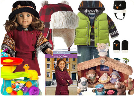 From left: GAP Buffalo Plaid Trapper Hat ($16.50), Playskool Explore n Grow Busy Ball Popper: ($25), American Girl – Rebecca Rubin ($118), Fisher-Price Little People Christmas: Nativity Set ($25), Gymboree Chairman of the Board Baby Boy outfit ($12-$21)