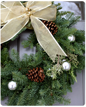 I fancied up an undecorated fresh wreath with leftover gold ball ornaments and discount gold wire ribbon to greet guests as they arrived.