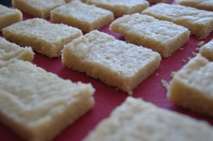 Take out of the oven and let cool for 15 minutes.  Cut into desired size.  Let cool 15 mins more and then remove the shortbread from the pan and place on a cooling rack.