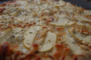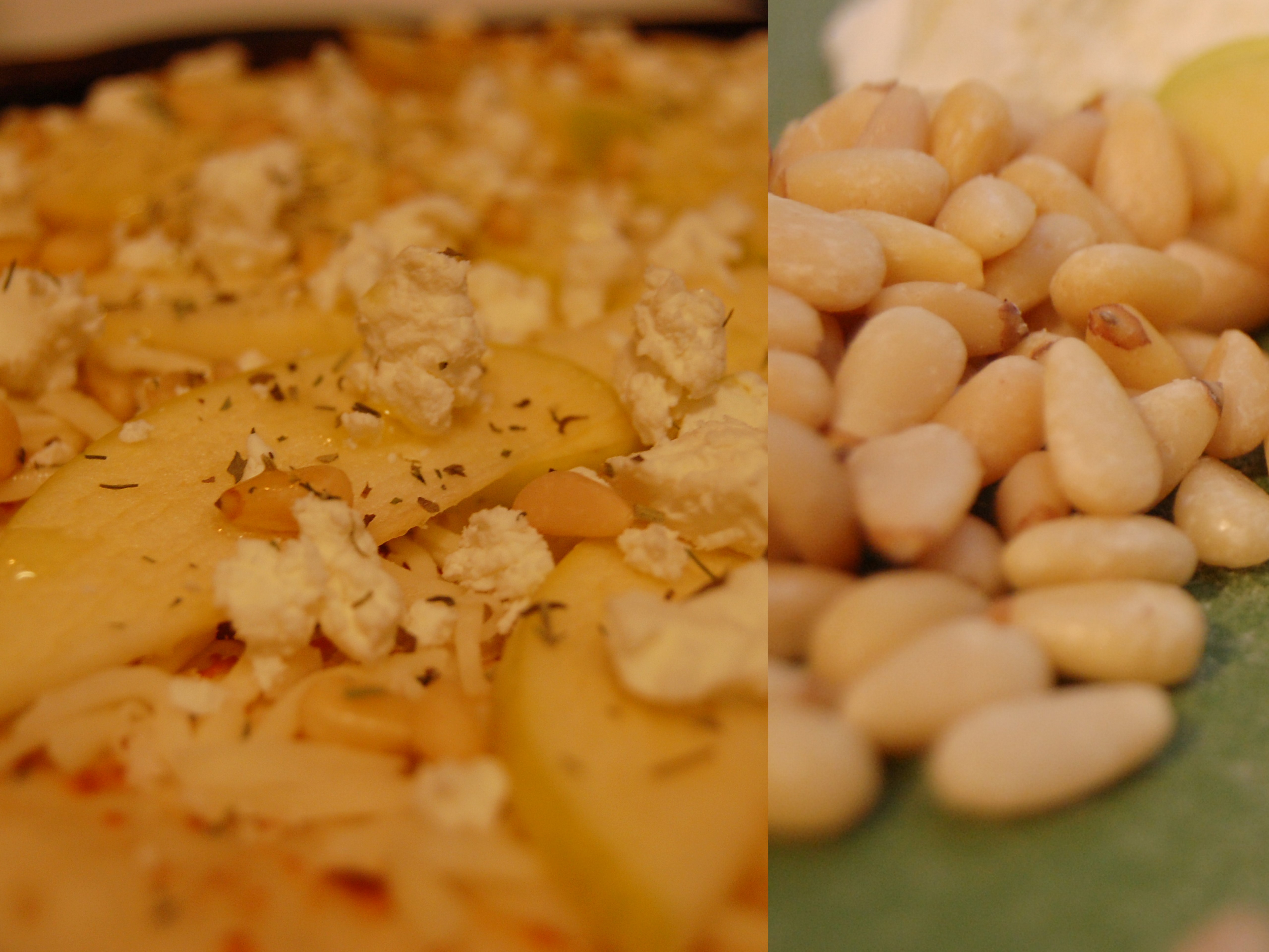 Take your pizza crust and lightly brush it with olive oil. Top with a very thin layer of mozzarella cheese, followed by desired amount of goat cheese, apple slices and pine nuts. Drizzle with olive oil and top with any dried herbs you may have on hand, I used marjoram and thyme.