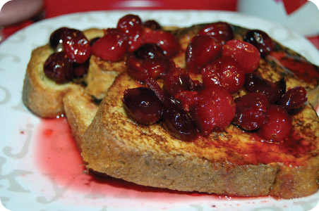 Place french toast on a plate and top it with a spoonful of chutney. Don’t overdo the chutney, you do not want to take away the flavor of the french toast. Or, if you don’t like the taste of cranberries, simply serve with a dusting of powdered sugar and some warm maple syrup. This dish tastes great with an Orange Strawberry Banana Smoothie or a homemade latte.