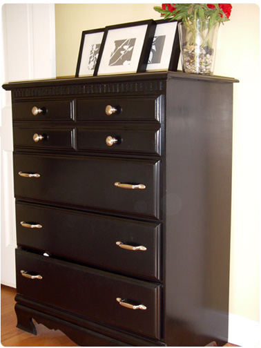 When my husband and I moved into our house, we inherited such a piece – his old wooden dresser from childhood. Unfortunately I can’t find my “before” pictures so you’ll have to just imagine a varnished and scratched up oak dresser with clunky brass handles. In my boredom last winter I turned said dresser (and a similar wooden bed) into good-as-new-beauties for under $30. Sure you can get creative with colors and pulls but for my first refinished project I stuck to the basics.