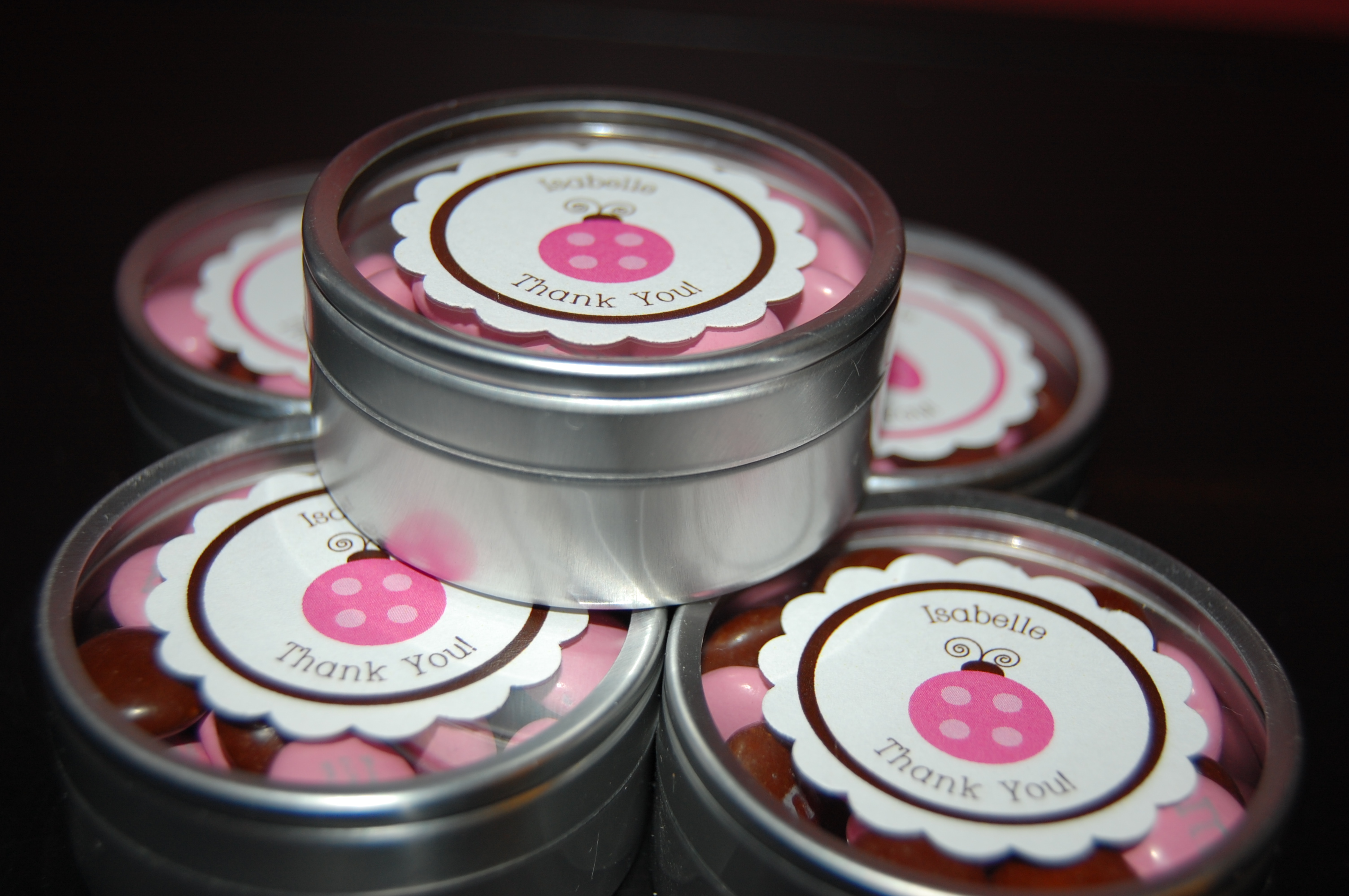 As favors, guests were given tins filled with pink and brown M&M’s and topped with an adorable ladybug tag also created by Ladybug Labels.