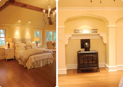 With soft linens and a fully functional wood burning stove fireplace in the room, I sure wouldn’t mind cozying up at night with the latest issue of Vogue and a glass of wine. The peaked ceilings in this room gave it such an open, airy feeling. Ahhh….