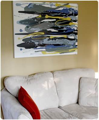 My husband and I spend a lot of time fishing on Lake Michigan, so I took inspiration from the smokey blue-green colors of the water for my palette. Using multiple quarts of latex paint, I went to town splashing and dripping the paint across a basic stretched cotton canvas.  Just call me Jackson Pollack.