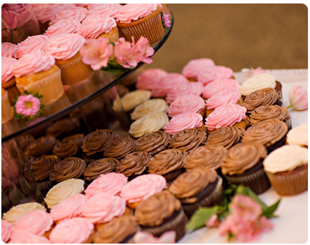 Instead of a traditional cake, we opted for multiple flavors of cupcakes frosted to match the wedding colors.