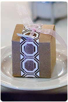 I’m from a large family and have tons of young cousins so my mom helped to turn my engagement photos into mini coloring books that we included in entertainment bags for all of the kids. We kept favors simple by filling kraft paper boxes with pink M&Ms and tying them with strips of brown patterned papers, sheer ribbon and little thank you tags.