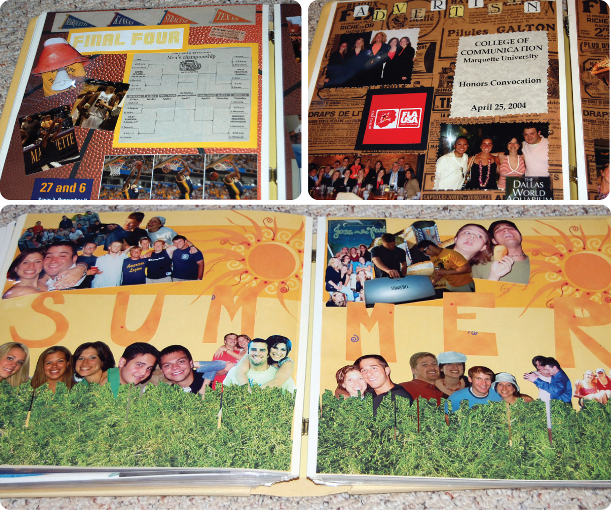 My college scrapbook is the only full-on book I have ever put together, but I have received two as a gift from my sister, who is exceptionally talented in the “scrapping” department. For my high school graduation, she put together a chronological book for me and gave it to me the morning of graduation, complete with prom pictures from two nights before.