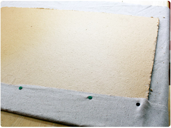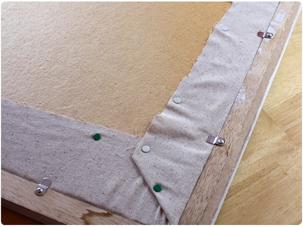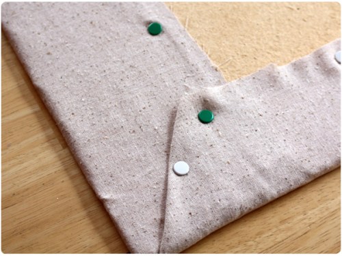 5. Start by folding the fabric over the edges of the board, leaving a few inches beyond the edge. Trim excess if necessary. Fold in the corners to form right angles and pull the fabric tightly across the back of the board. Secure with a thumbtack or a staple gun. Repeat for each side of the board.