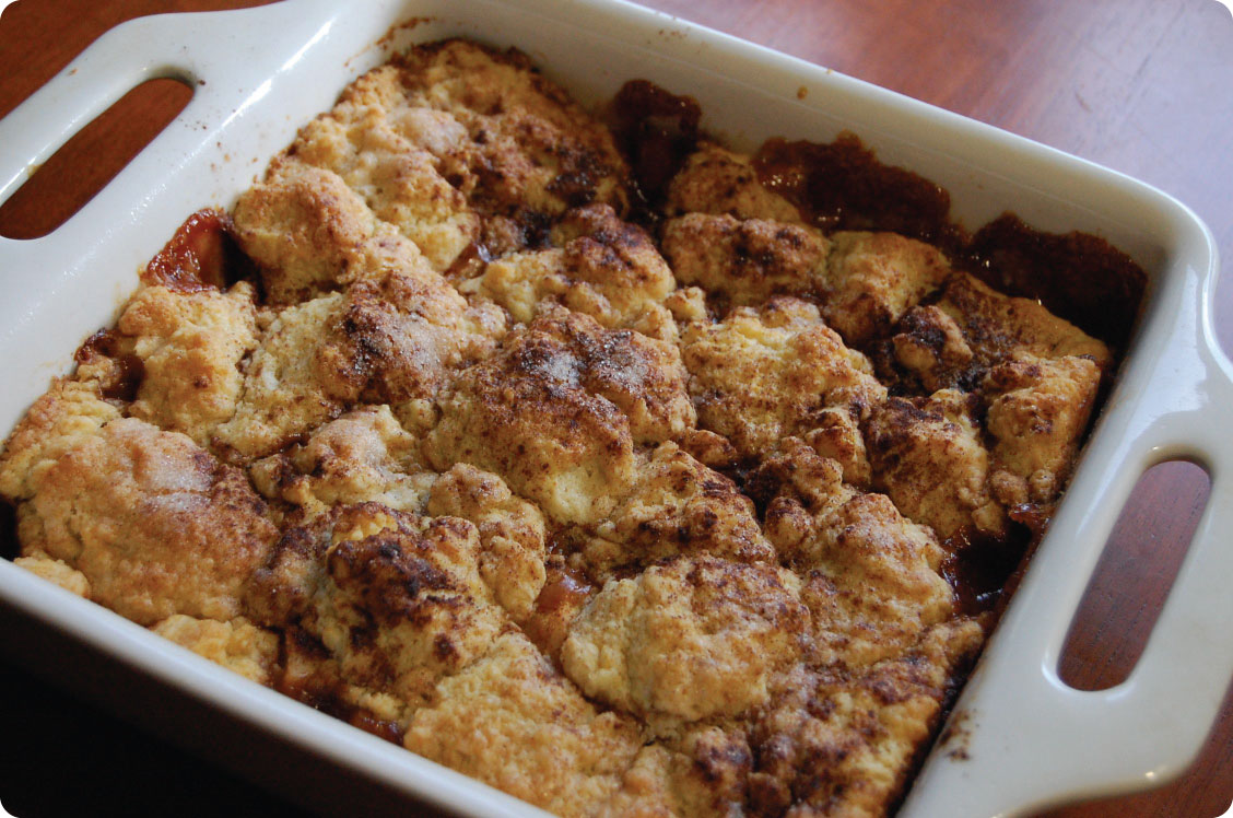Transfer peaches to 2 quart baking dish. Drop spoonfuls of pastry dough on top of peaches. It is okay to leave a few gaps. Brush heavy cream on top and dust with sugar and cinnamon. Bake for 40-50 minutes, until golden brown. Serve with a scoop of vanilla ice cream (Edy’s Slow Churn Vanilla Bean is my fave!)