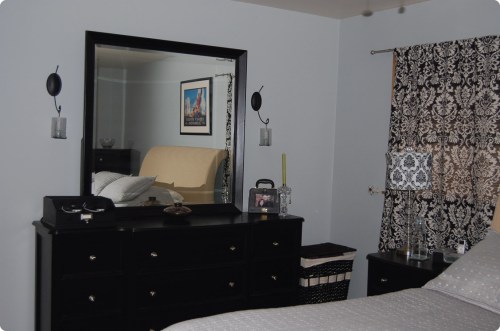 The bedroom looks great! I love the gray. However, I also love white walls… we recently redid our bedroom with white walls, white bedding, white curtains, and wood furniture with oriental and lambskin rugs and a few colorful accents – we find it much more soothing than the dark chocolate brown that was there when we moved in (we also have a tiny bedroom so it opens things up a bit).