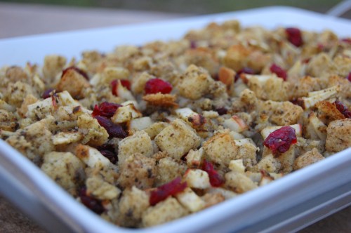 This recipe has everything I think a good stuffing should have.  The addition of the sage, cloves and thyme make it incredibly fragrant and the diced apples and dried cranberries add the perfect paring of sweet and savory.