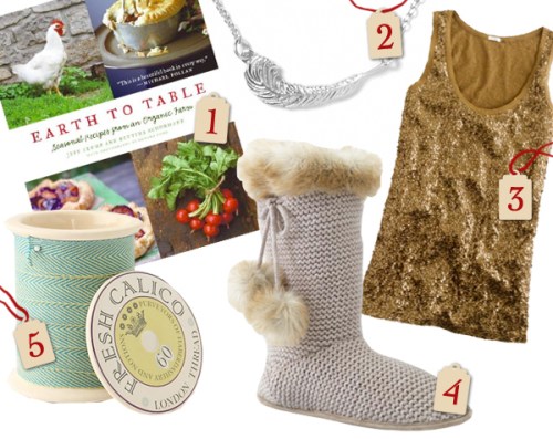 1. Earth to Table cookbook ($34.99), 2. Feather necklace ($39.50), 3. Sequin tank ($69.50), 4. Fur trimmed booties ($29.95), 5. Spooled candles ($16-34)