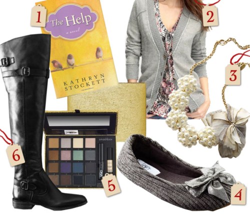 1. The Help ($12), 2. Alpaca cardigan ($110), 3. Aspiring Atoms necklace ($29.95), 4. Bow slippers ($24.50), 5. Smashbox Eye Wish palette ($45), 6. Over the knee boot ($198)