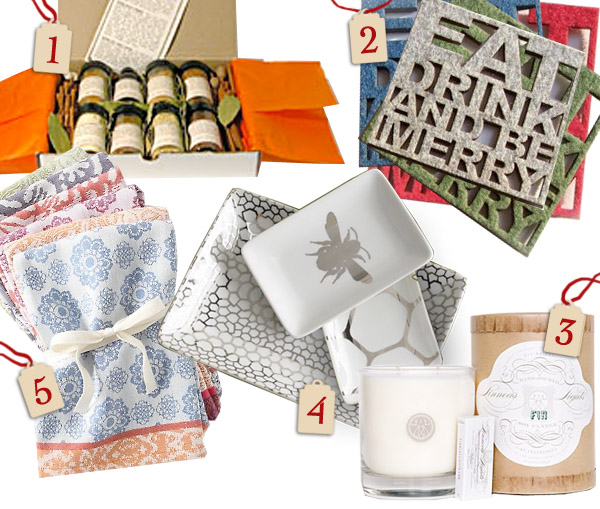 1. Spice gift box ($20-50), 2. Felt Merry Coasters ($28), 3. Linnea’s Light’s Fir Candle ($29), 4. Entertaining Platters ($29), 5. Nifty napkins ($32)