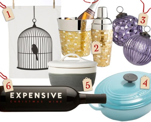 1. Bird cage tea towel ($14), 2. Gold mosaic ice bucket ($20-30), 3. Antique glass ornaments ($5.95), 4. Le Creuset dutch oven ($129.95), 5. Chalkboard jam pot ($18), 6. Expensive Christmas wine ($25)