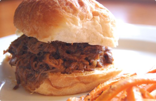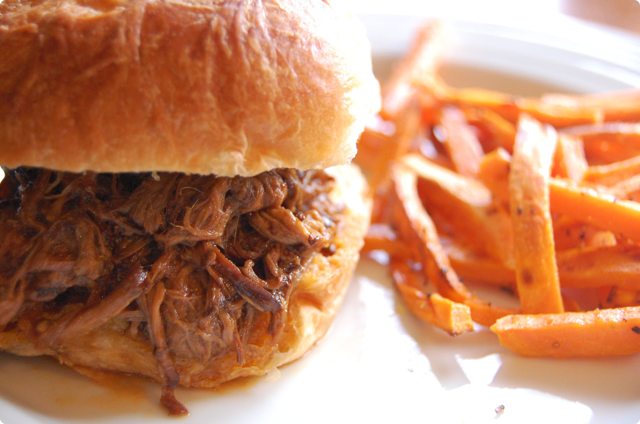 I typically serve these sandwiches with sweet potato fries. One of my favorite parts of this meal is the leftovers. You can freeze the beef and reheat a few weeks later when you just aren’t (gasp!) in the mood to cook.