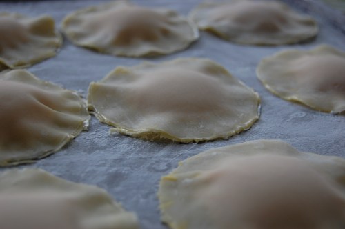 Now, you are finally ready to assemble your ravioli.  Start with one circle and place a small teaspoon sized dollop of the butternut squash mixture in the center leaving a good boarder around the edge.  Be sure not to overfill or you might have a hard time sealing them.  Dip your finger in the egg and completely coat the outside boarder.  Top with another circle and press all edges until the ravioli is sealed.  Then, with the edge of a spoon, go around the ravioli, pressing down to be sure they are sealed up tight.  (This will help prevent them from opening when they are placed in the boiling water.)