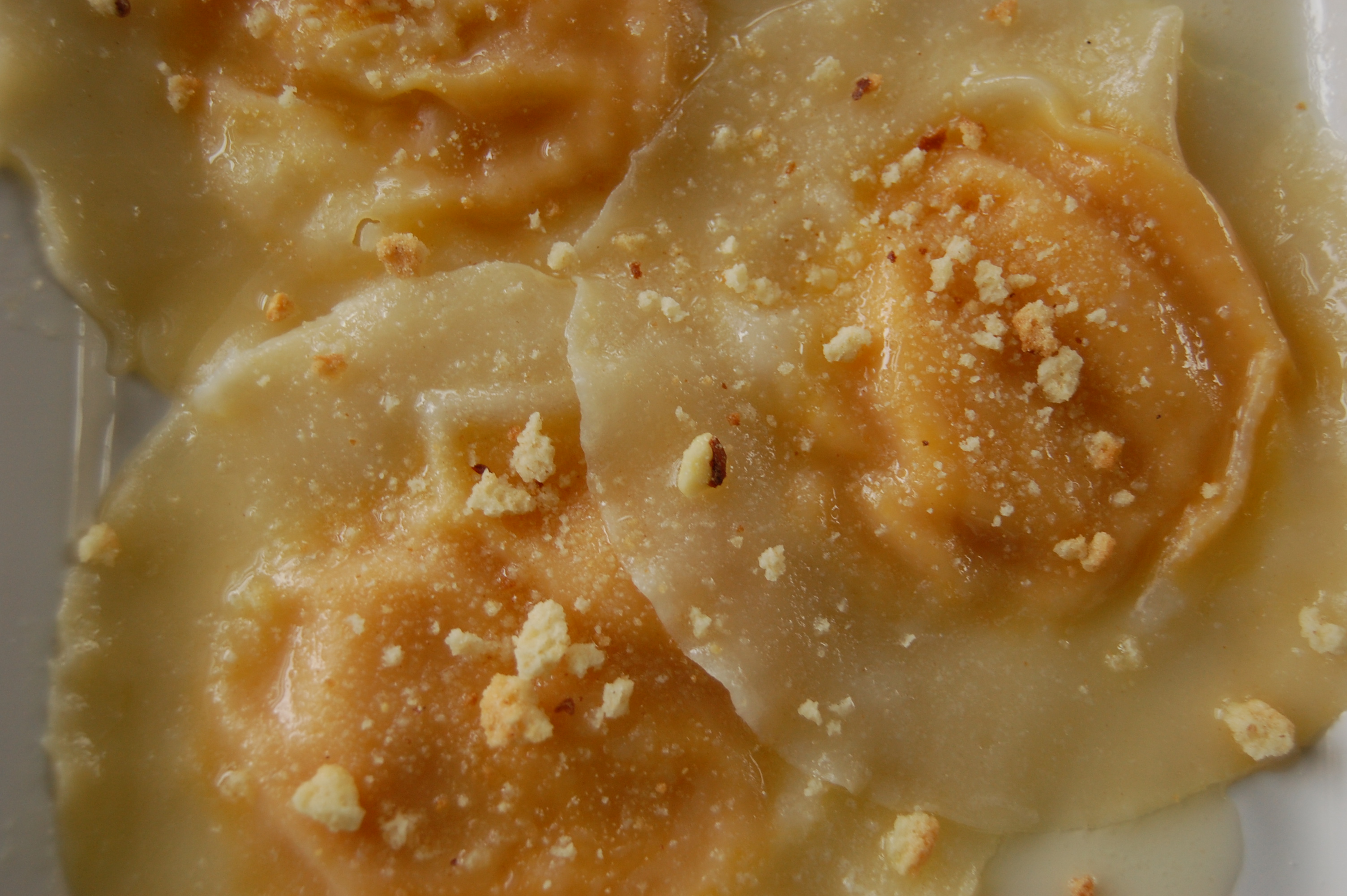 While digging through my freezer the other day, I came across some pureed butternut squash that I made and froze last fall.  It has almost been 6 months, so I needed to use it up!  I got an idea to try and recreate one of my favorite Milwaukee dishes, Butternut Squash Ravioli from the amazing restaurant La Merenda.  They are tender, sweet ravioli topped with melted butter and a crushed, crunchy almond cookie.