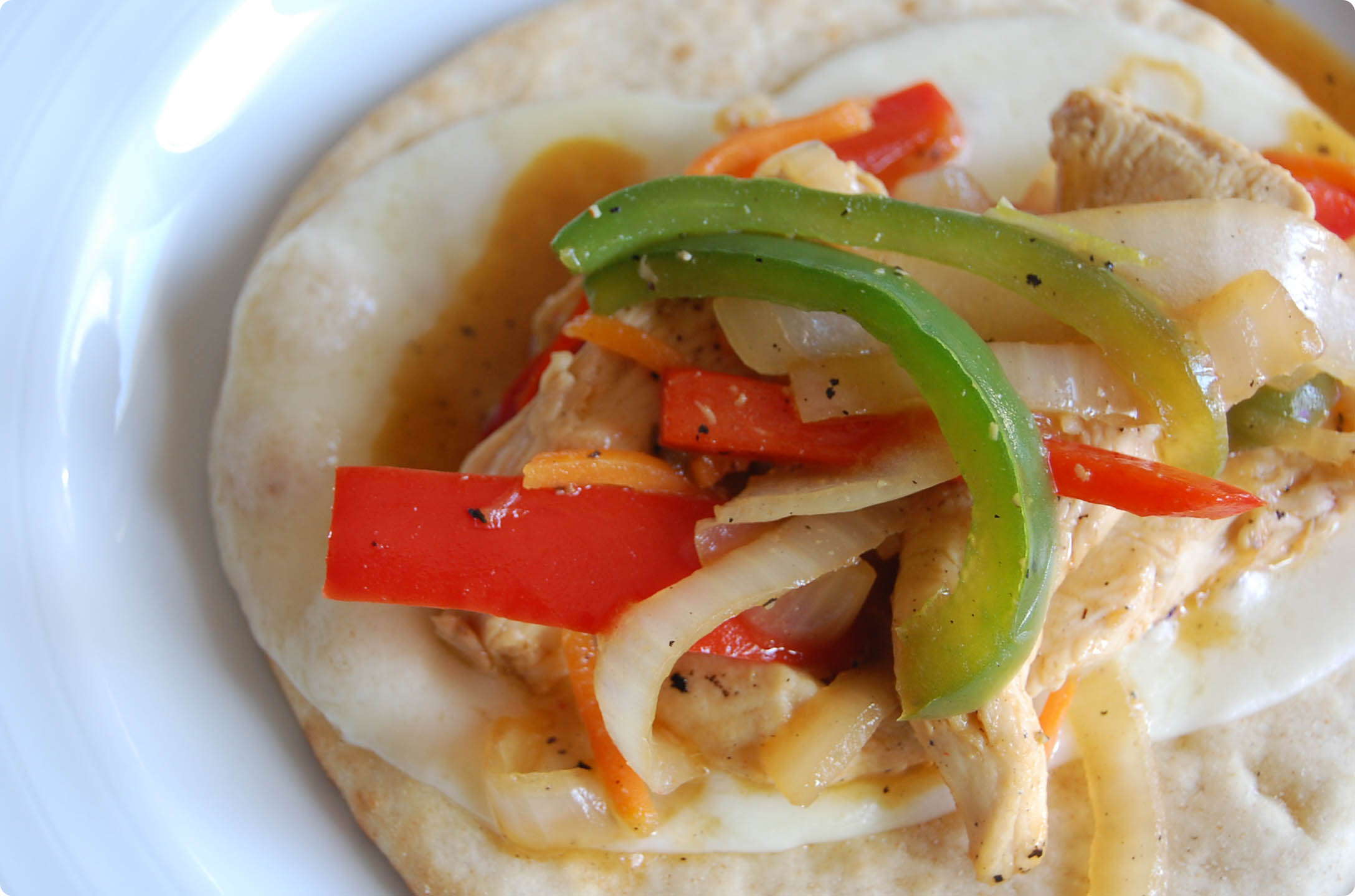 Preheat oven to 400 degrees. In a skillet pan or wok, heat olive oil. Season chicken with salt and pepper and add to skillet. Cook chicken 3-4 minutes on each side. Add peppers, onion, carrots and garlic powder. Stir until vegetables soften, about 5-6 minutes.