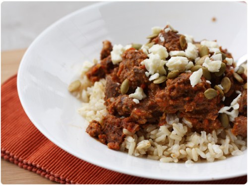 Serve with brown rice, cotija cheese and extra pepitas.
