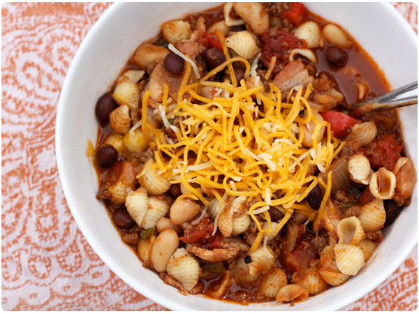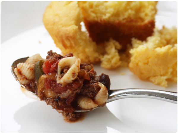 Serve over small shell noodles or rice with shredded cheddar cheese and/or sour cream. Serve with cornbread.