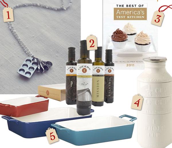 1. Little baker necklace ($29) 2. Vinegar & Olive oil set ($48) 3. The Best of America’s Test Kitchen ($35) 4. Milk bottle measuring cups ($24) 5. Three piece potluck baker set ($29.95)