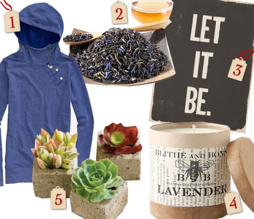 1. Alex Premium Pullover hoodie ($59) 2. Earl Grey Creme tea (from $5) 3. Let It Be print ($30) 4. Lavender candle ($26) 5. Succulent cube garden ($79)