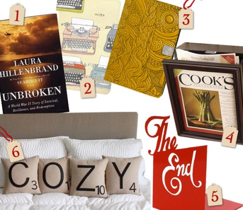 1. Unbroken by Laura Hillenbrand ($13.50) 2. Typewriter Journal ($10.95) 3. EReader Cover ($70) 4. Wall Mount Magazine Shadowbox Organizer ($34) 5. The End Bookends ($30) 6. COZY Letter Scrabble Pillows ($72)