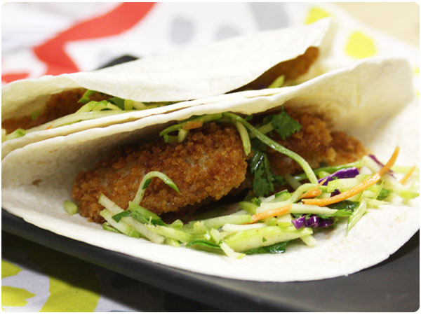 Test temperature of oil by carefully flicking a tiny bit of water or 1-2 panko crumbs into the pan. Oil should pop if it is hot enough. If oil is not hot enough, your fish will soak up oil and be greasy instead of crispy and flaky. Carefully add fish pieces to the hot oil, frying for 2-3 minutes per side and turning with a tongs part way through the process. While fish are frying, set up a plate with 1-2 paper towels. Extract one fish and double check that it is done. Fish should be golden brown and flaky in the center. Transfer fish to the towels to absorb any excess oil. Assemble tacos immediately.