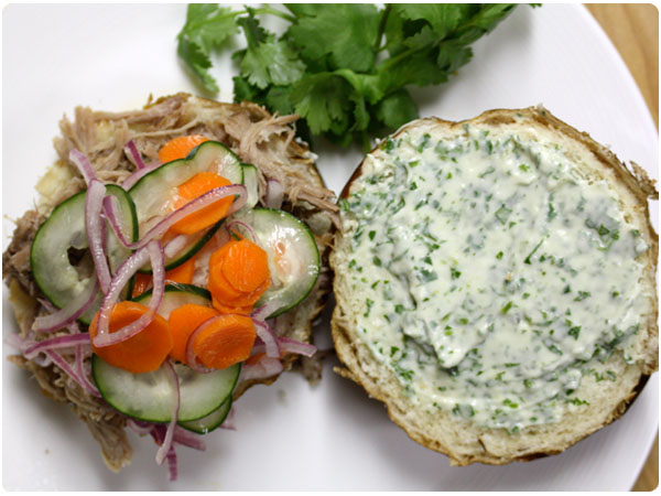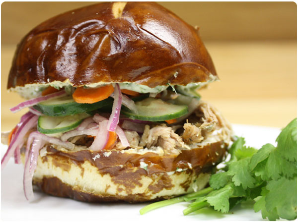Pulled Pork Sandwich with Ginger Cilantro Mayo and Pickled Vegetables