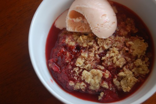 As I mentioned last week, strawberries have been in full effect in our house. One of my favorite desserts (more than pie! shhh…) is a good, warm fruit crisp. I’ve yet to try a recipe that tops this one. The rhubarb and the orange flavoring perfectly balance out the sweet and tart of the strawberries. The top tastes like a warm crumbled oatmeal cookie. I found this recipe in Food Network Magazine awhile back and have adapted it a little bit to meet my taste buds. If you brave turning your oven on in this heat (it’s not too bad in the air conditioning), give this recipe a try! You won’t regret it.