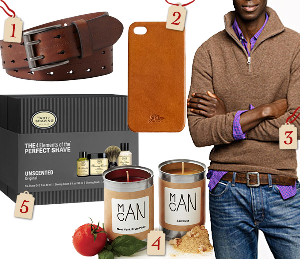 1. Clarkson Belt ($35) 2. Leather iPhone case (from $20) 3. Lambswool Half-zip Sweater ($75) 4. Man Candles ($15) 5. Art of Shaving Kit ($115)