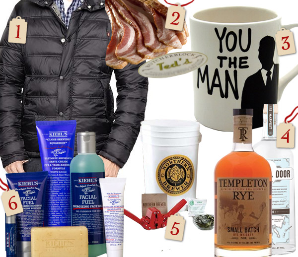 1. Quilted Puffer Jacket ($98) 2. Bacon of the Month Club (from $78) 3. You the Man mug ($16) 4. Artisan whiskey or gin (prices vary) 5. Homebrew Starter Kit ($80) 6. Kiehl’s Ultimate Man Set ($58)