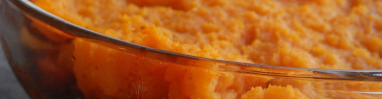 Place meat mixture in a square or round 8 inch baking dish. Press mashed sweet potatoes over the top of the mixture. Bake in oven for 15-20 minutes, or until potato top becomes a bit crusted.