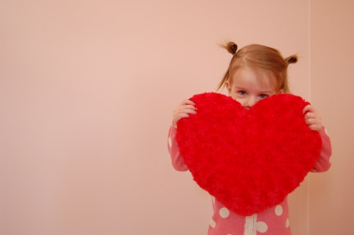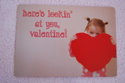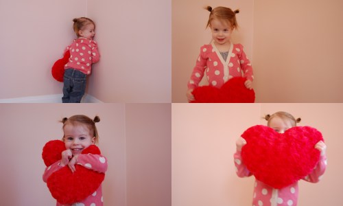 Every year, we send valentines to family and friends and I was getting a little tired of the same old Valentine’s Day selection. So, I decided to create my own Valentine’s using things I had around the house: my camera, my photogenic 2 year old and a cute pink polka dot sweater. I will admit, I did go out and purchase a red heart shaped pillow from the $2.50 bin at target, but luckily that didn’t break the bank.