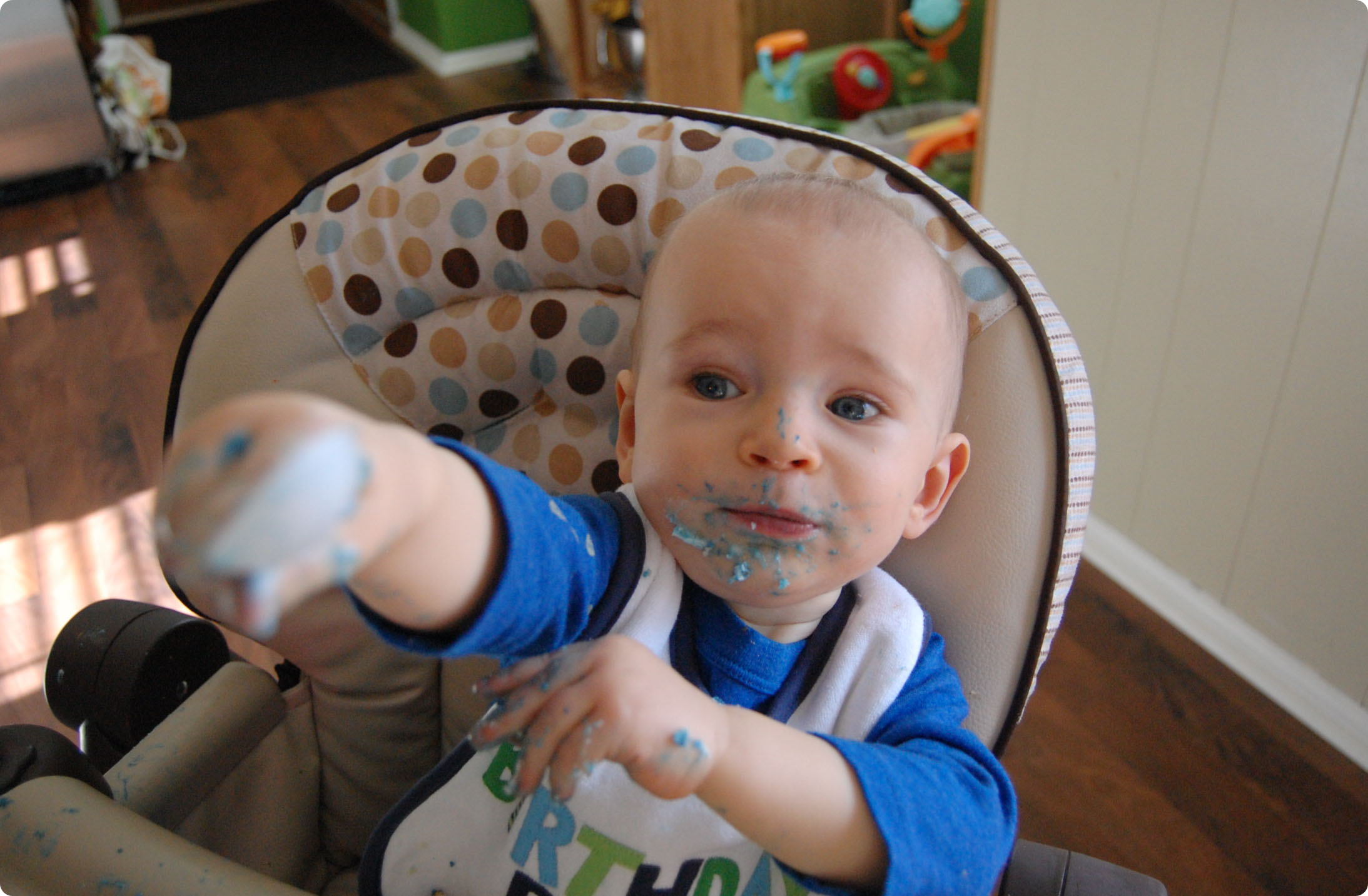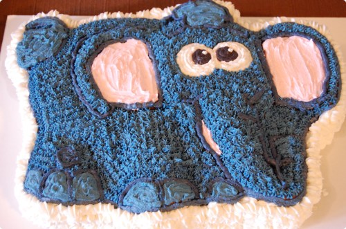 Lincoln tore into a piece of Mommy’s labor of love elephant cake. The cake was baked in a Wilton cake form using the Wilton recipes for butter cake with buttercream frosting.