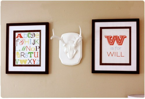 My favorite part about the room are the many accent pieces that were handmade by family, friends or myself, such as these deer blankets and pillows. Using silhouettes paired with glossy white pieces, like the antler mount or owl lamp, make the outdoorsy elements feel more modern than hunting lodge.