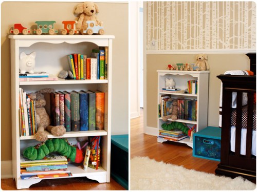 I updated an old bookcase with white paint to hold Will’s toys and many children’s books. Additional toys are stashed in a brightly colored plastic container to prevent the pooch from chewing on them. A fluffy flokati rug softens up the heavy furniture and adds cushion to the hardwood floors for playing.
