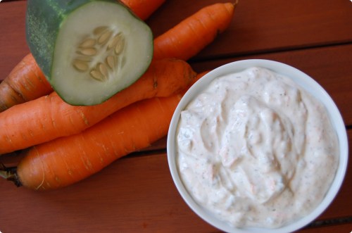 Add yogurt and sour cream to a large bowl. Stir thoroughly. Add cucumber and carrots, mix well. Add dry spices, mix well. Make sure to taste before serving to make sure the spices are to you or your child’s palette.