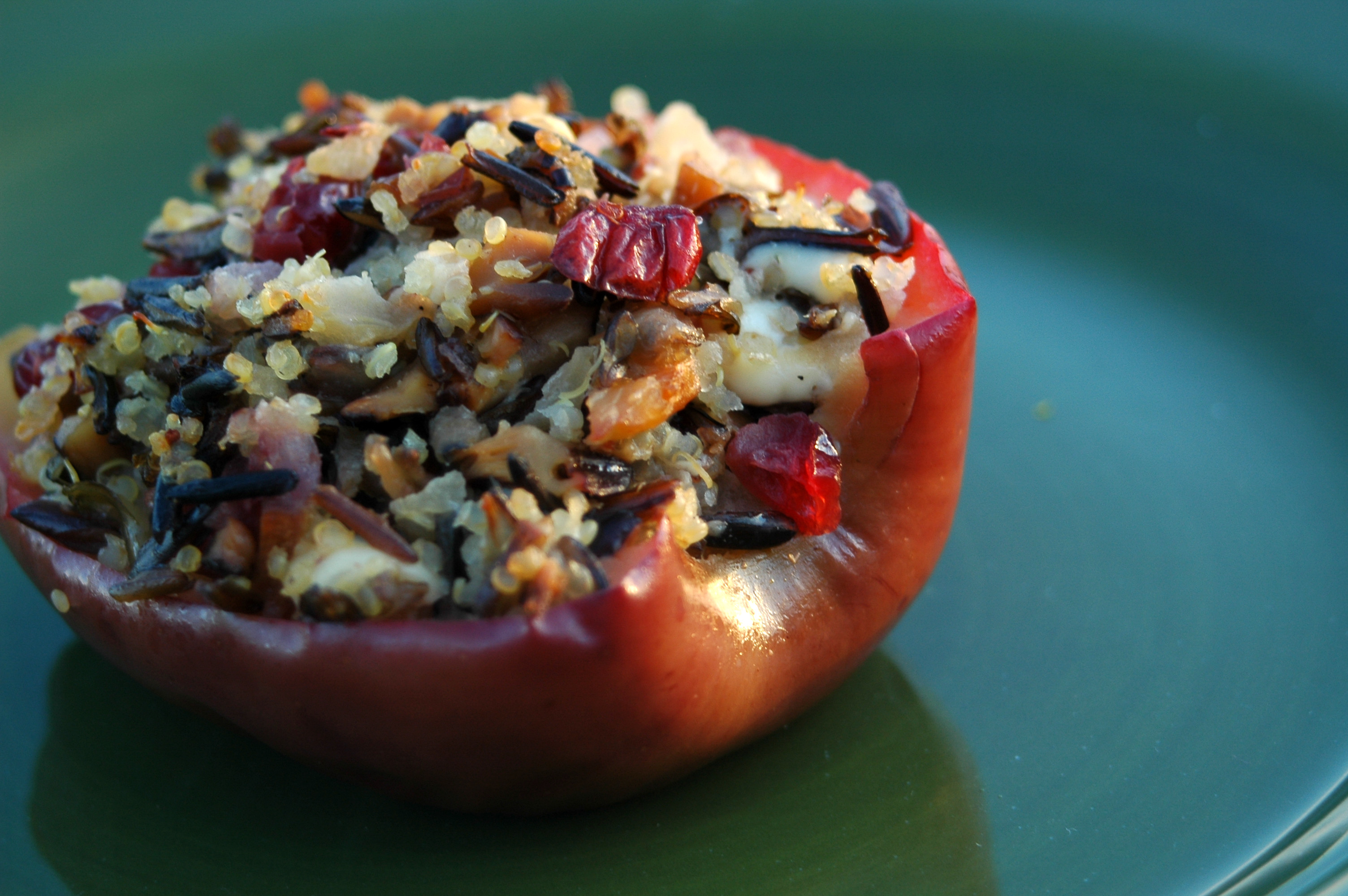 A holiday all about food! This one has my name all over it. You’ve seen Katie’s Stuffed Squash.. maybe even my Crab-Stuffed Zucchini.. So, why stuff something else from the produce department? You would be forgiven for thinking it was an attempt at being coy–Apples.. Haute Apple Pie.. get it?—but the truth is, for holiday meals I’m drawn to tying traditional staple ingredients into a fresh, new presentation. Cranberries, apples, wild rice and sage are all holiday staples, and here they come together in a glam, single-serving twist without detracting from the traditions of the Thanksgiving table.