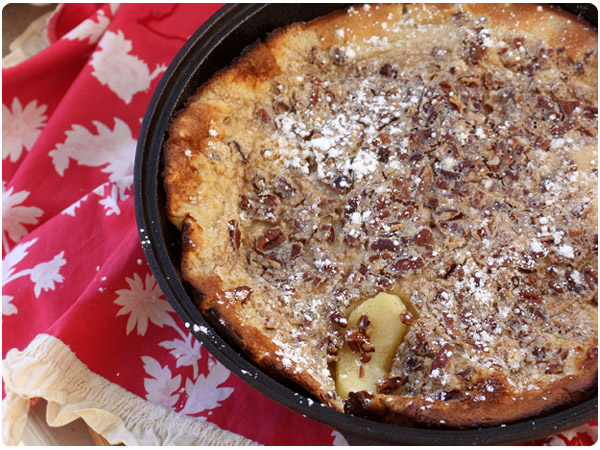 Even though this puffy pancake looks dramatic (if only for a few minutes before it deflates!), I found it easier than normal pancakes because you bake one for the entire family and don’t have to sit over the griddle flipping individual platefuls. A great way to use only a few apples and still have some for snacking on!