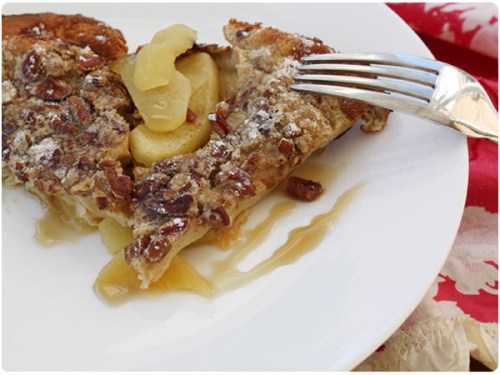 Gently use a fork to arrange apples evenly across the bottom of the pan. Slowly(!) pour batter into pan over apples. Pouring too fast will cause the apples to move around. Sprinkle pecans evenly on top. Bake in pan for 13-15 minutes until pancake is puffy and golden brown. Remove from oven and dust with powdered sugar. Serve immediately with whipped cream or maple syrup.