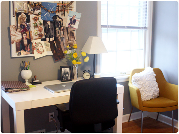 Since the room is not huge, I chose the slim, modern Parsons desk from West Elm and surrounded it with things that will inspire me while I work or blog, like my DIY idea board, fresh flowers and scented candles. Every day supplies like pens and scissors look decidedly more chic in a vintage milk glass vase.