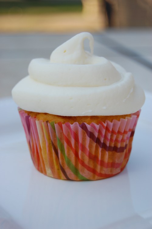 Fill cups with batter – almost to the top. Bake for 20 minutes, rotating pan halfway through. Transfer cupcakes to wire rack to cool before frosting. Yields 12-18 cupcakes.
